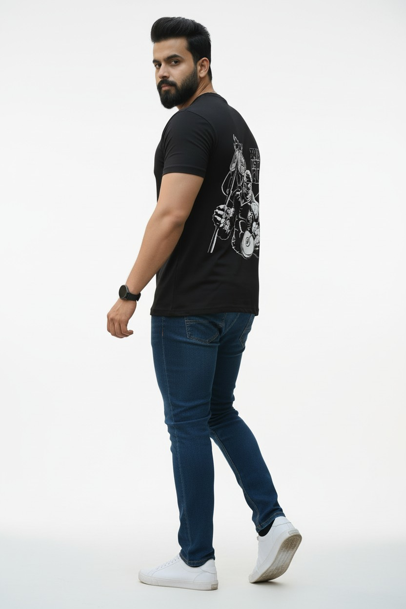 Unleash your inner strength with The Iron Gorilla tee. This premium black crew neck features a high-impact white graphic of a powerhouse gorilla drummer on the back - a symbol of raw intensity and disciplined rhythm.
